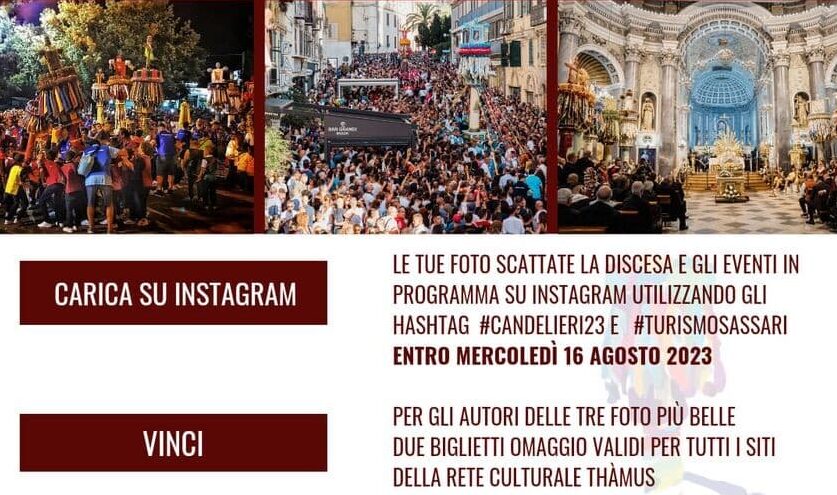 La Discesa dei Candelieri diventa l’occasione per il contest fotografico “I Candelieri 2023 – Le foto più belle”, promosso dal Comune di Sassari. L’iniziativa mira a valorizzare le migliori produzioni fotografiche digitali condivise con il social network Instagram, realizzate durante la Discesa dei Candelieri e gli eventi che la precedono. Sul sito www.turismosassari.it è pubblicato il regolamento integrale.