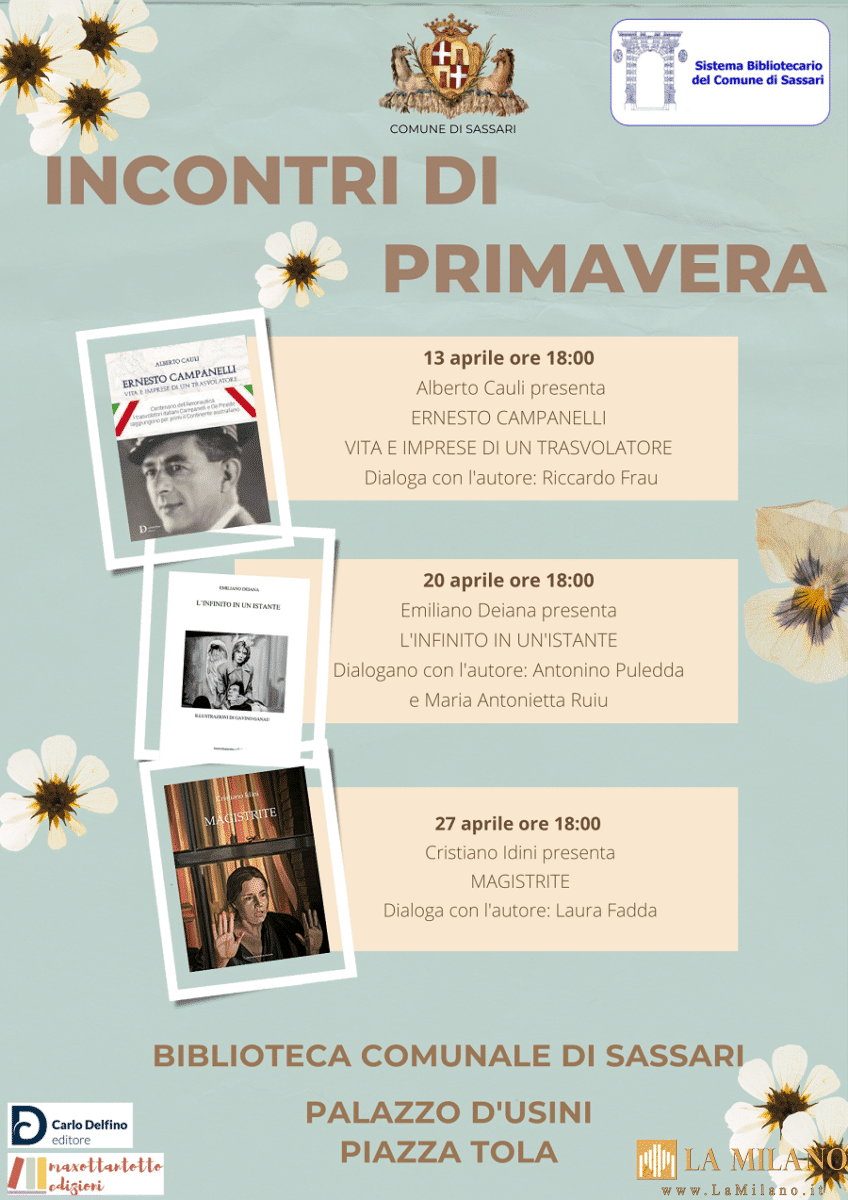 Con l’intento di avvicinare quante più persone alla lettura, la Biblioteca comunale di piazza Tola propone la rassegna “Incontri di primavera”: serate alla scoperta dei libri con gli autori. Tutti gli eventi si svolgeranno nella sala conferenze della Biblioteca comunale, in piazza Tola, alle 18 con libero ingresso. Si parte il 13 aprile, in occasione del centenario dell’Aeronautica Militare, Alberto Cauli presenterà “Ernesto Campanelli. Vita e imprese di un trasvolatore”: storia del grande trasvolatore nuorese e autore del celebre raid dei 55.000 chilometri dall’Italia a Tokyo a bordo di un idrovolante dal 20 aprile al 7 novembre 1925.